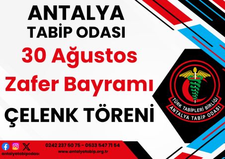 Değerli Meslektaşlarımız, 30 Ağustos Zafer Bayramı nedeniyle, 30 Ağustos Cumartesi günü saat 09.15’te Cumhuriyet Meydanı’nda Atatürk Anıtı’na çelenk sunma töreni yapılacaktır. Katılımlarınızı bekleriz. Antalya Tabip