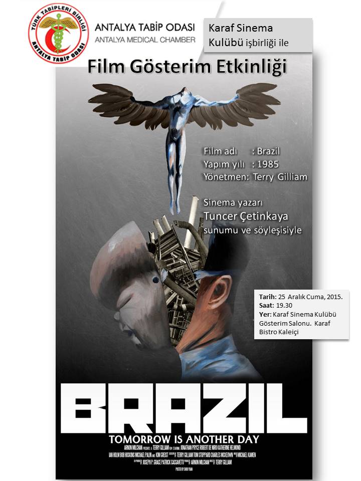 Sinema yazarı Tuncer Çetinkaya söyleşisi ile birlikte Karaf Bistiro Kaleiçi’nde 1985 yılı yapımı Terry Gliam’ın yönettiği “Brazil” filminin gösterimi gerçekleştirilecektir.