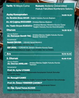Antalya Barosu Sağlık Hukuku Kurulu tarafından düzenlenen Sağlık Turizmi Hukuku Sempozyumu 16 Mayıs Cuma günü saat:14.00-17.30 arasında Akdeniz Üniversitesi Hukuk Fakültesi Konferans Salonu’nda gerçekleştirilecektir.